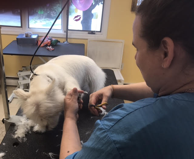 Full-Service Grooming includes everything from head to tail. We start by brushing out their coat to remove all knots and take out excess shedding. Their sanitary area is then shaved and their nails are trimmed. The hair in the ear canal is removed and their ears are cleaned. An in depth scrubbing of their coat with two kinds of shampoos are used to ensure cleanliness and a fresh scent. Their teeth are then brushed and after the dog shakes we towel dry and use a force air dryer with no heating element to ensure a soft fluffy coat. The specific haircut is based upon your dogs breed standard and or your individual style choice. All dogs are then finished with colognes and either a bow or a bandana so they look, feel and smell amazing!