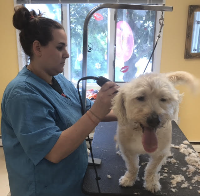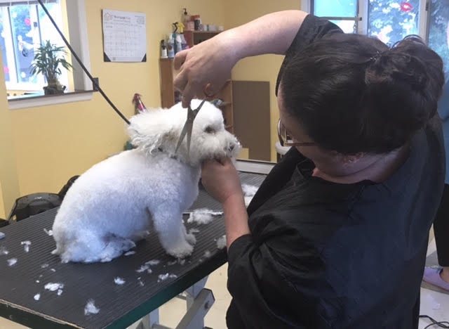 Full-Service Grooming includes everything from head to tail. We start by brushing out their coat to remove all knots and take out excess shedding. Their sanitary area is then shaved and their nails are trimmed. The hair in the ear canal is removed and their ears are cleaned. An in depth scrubbing of their coat with two kinds of shampoos are used to ensure cleanliness and a fresh scent. Their teeth are then brushed and after the dog shakes we towel dry and use a force air dryer with no heating element to ensure a soft fluffy coat. The specific haircut is based upon your dogs breed standard and or your individual style choice. All dogs are then finished with colognes and either a bow or a bandana so they look, feel and smell amazing!